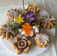 Zutaten für 7 kleine Formen: 50 g weiche Butter 10 g Zucker 1 EL sehr fein geriebener Ingwer 3 Eigelb 10 g Zucker 125 g fein geriebene Karotten 1 TL abgeriebene Zitronenschale (Bio) 1 EL Zitronensaft 125 g gemahlene Mandeln 3 TL Rum 50 g Weizenmehl 1/4 TL Backpulver 3 Eiweiß 1 Prise Salz 60 g Puderzucker für die Garnitur: Puderzucker Schokoladenguss Zuckerperlen |