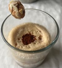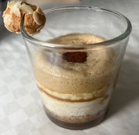 Zubereitung: Die Kekse in einen Gefrierbeutel füllen, mit einem Nudelholz fein zerkrümeln und dann auf 4 Dessertgläser oder -schalen verteilen.. Puddingpulver mit Zucker vermischen. Die Milch erhitzen, das Puddingpulver einrühren und kurz aufkochen lassen. Den Pudding in eine Schüssel füllen und abkühlen lassen. Etwas Frischhaltefolie auflegen, damit sich keine Haut bildet. Den abgekühlten Pudding mit Joghurt oder Quark zu einer Creme verrühren und auf die Keksschicht verteilen. Den Rohrzucker in den heißen Espresso rühren und abkühlen lassen. Anschließend mit einem Milchaufschäumer oder Mixstab zu einem stabilen Schaum aufschlagen und auf esslöffelweise auf die Puddingcreme setzen. Mit etwas Kakaopulver garnieren und alsbald servieren. Anmerkung: Statt Puddingcreme kann man auch geschlagene Sahne nehmen.